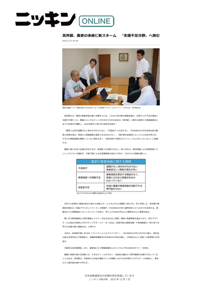 FOODBOXが筑邦銀行様とともに取り組む「農業の事業承継支援スキーム」が、ニッキンONLINE(2025年12月1日付)にて紹介されました!